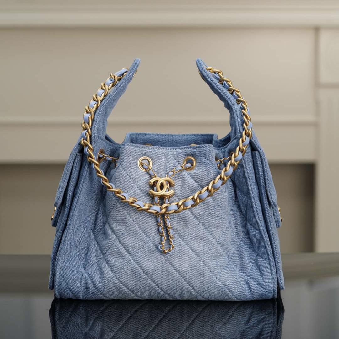 香奈兒hobo25c尺寸對照表 香港北區粉嶺 Chanel hobo 抽繩水桶包 淺藍牛仔大號
