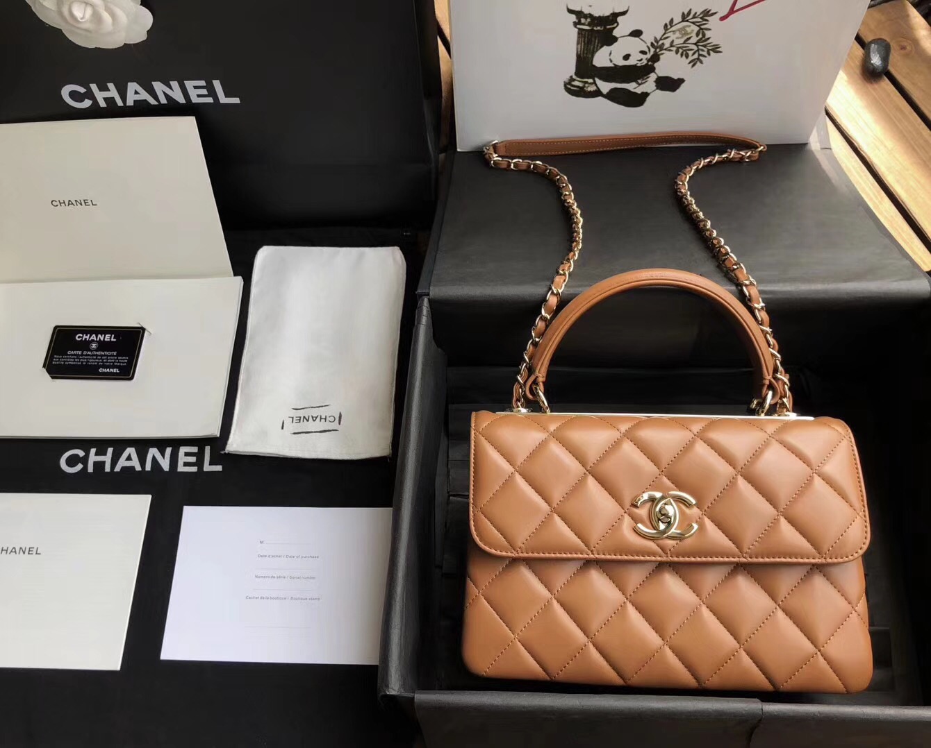 小香Trendy bag CC菱格形焦糖色羊皮手提口盖包
