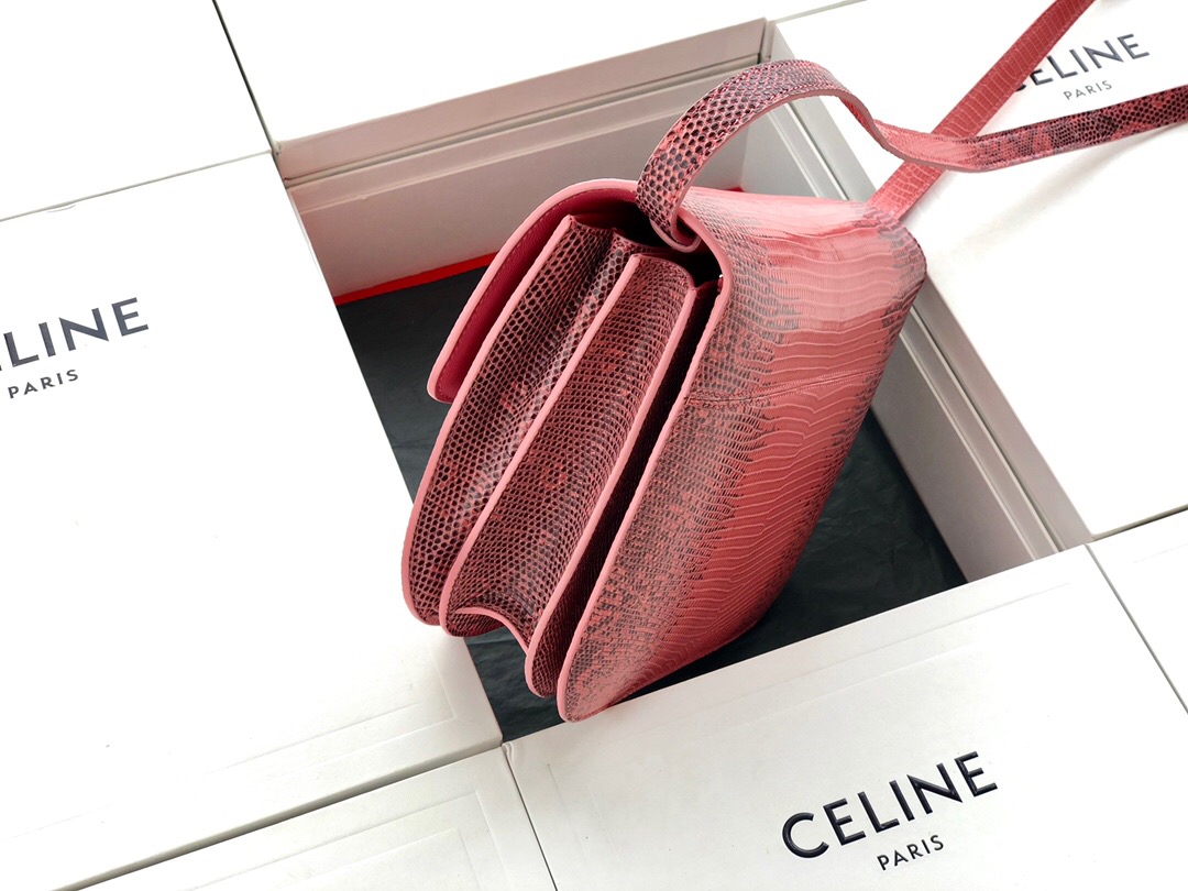 celine瑟琳 CLASSIC 中号蜥蜴皮BOX手袋 100%蜥蜴皮 (圆鼻巨蜥) 100%小羊皮衬里 银色金属件 肩背或手提 黄铜锁扣 内侧拉链口袋和双层扁平口袋 西瓜红色 (24 X 18 X 7厘米)