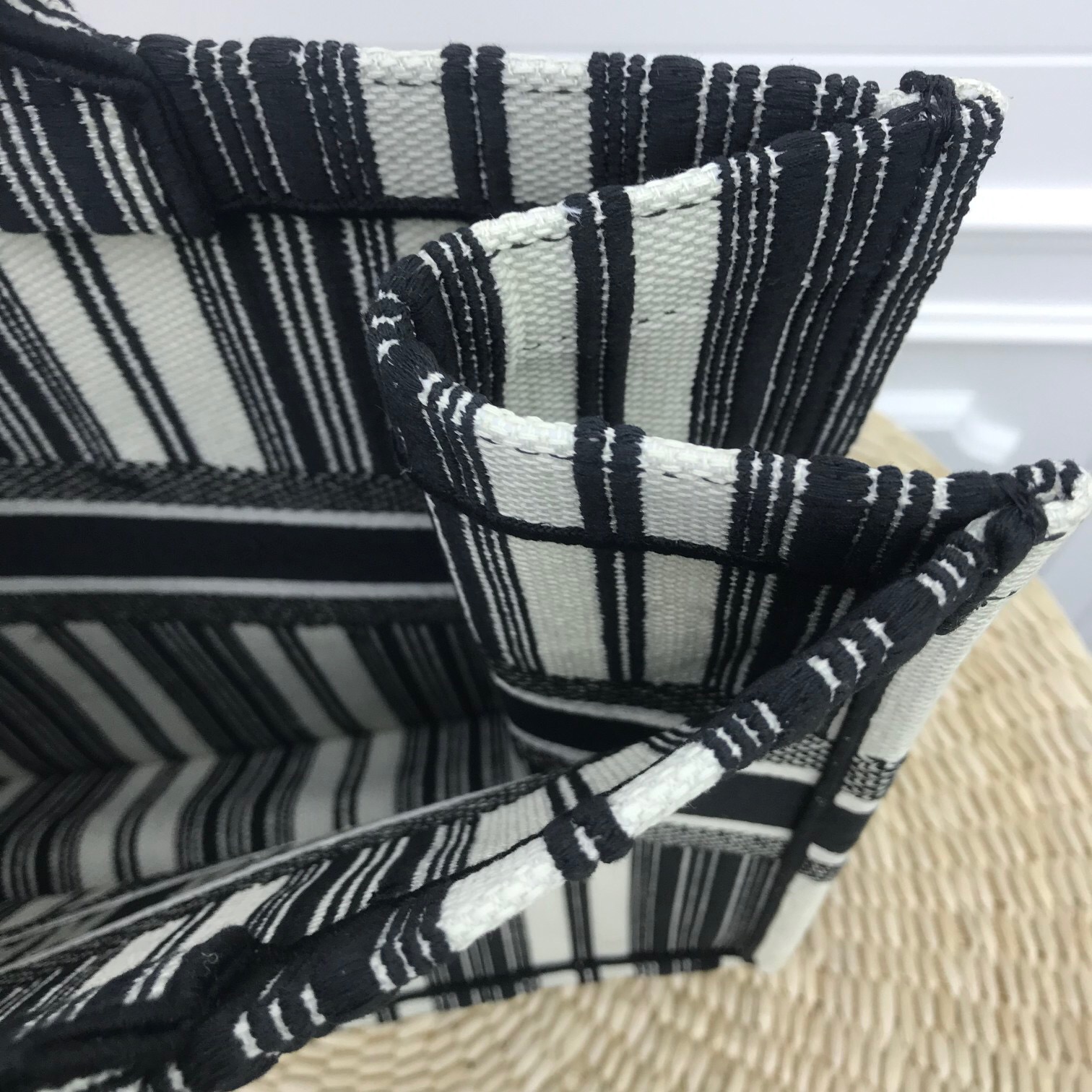 迪奥刺绣购物袋正品细节图 DIOR book tote toile de jouy条纹黑购物袋