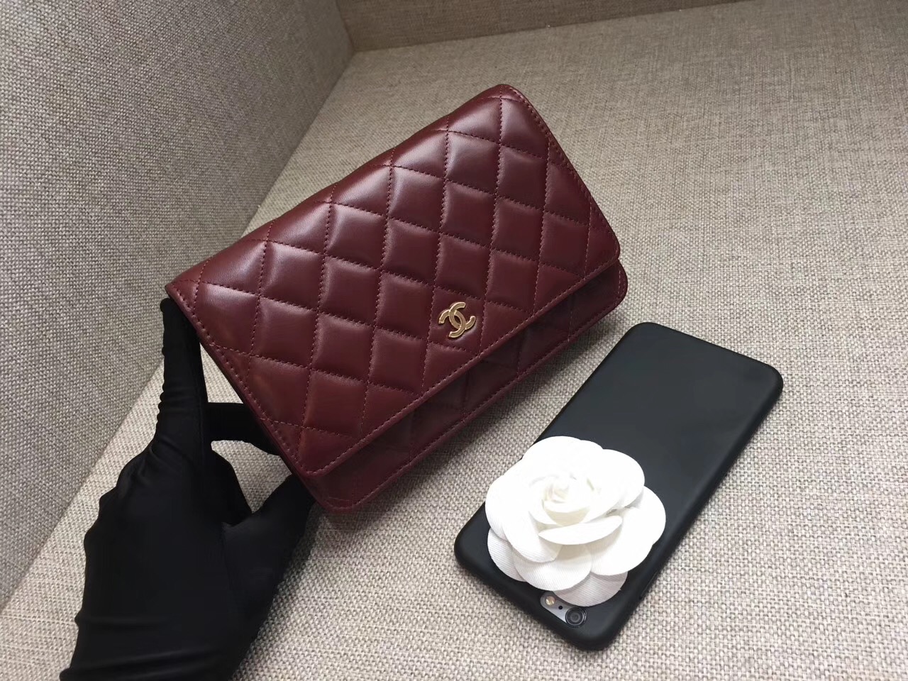 Chan.l Classic wallet on chain Lambskin Gold-tone Metal 菱格車縫線 經典款小羊皮酒紅色 金色五金金屬