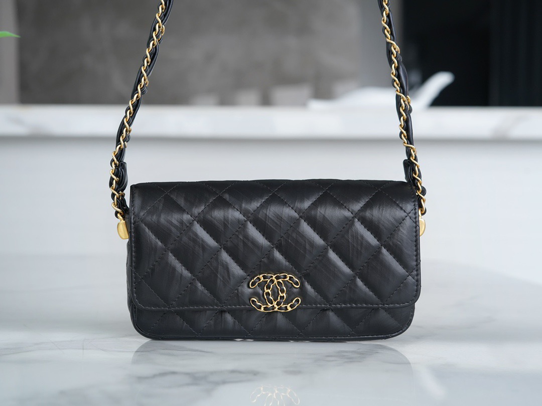寬肩帶黑金褶皺牛皮,經典菱格紋設計與皮穿金屬的鏈條搭配
