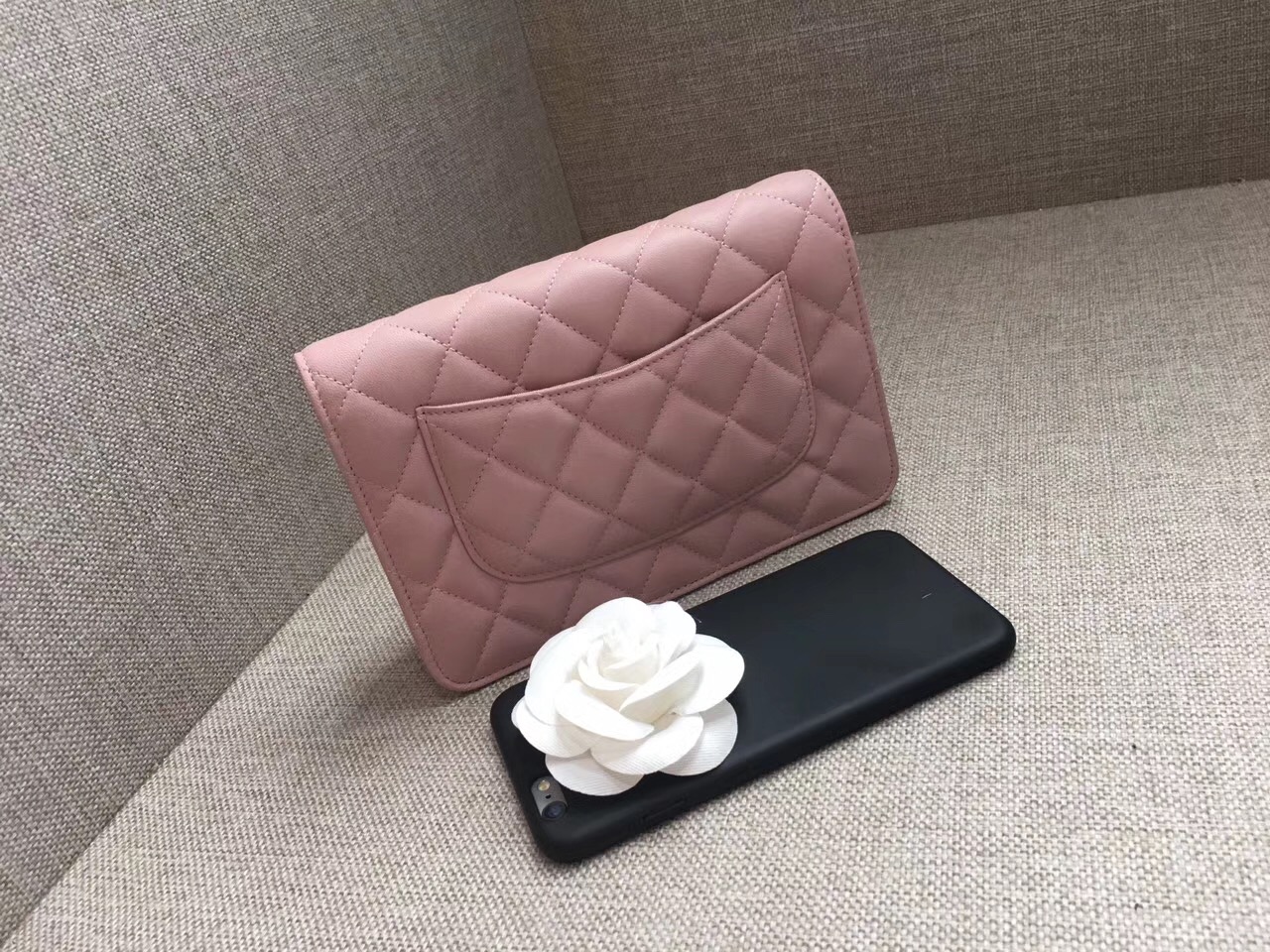Chan.l Classic wallet on chain 菱格小羊皮粉色woc 金色金屬