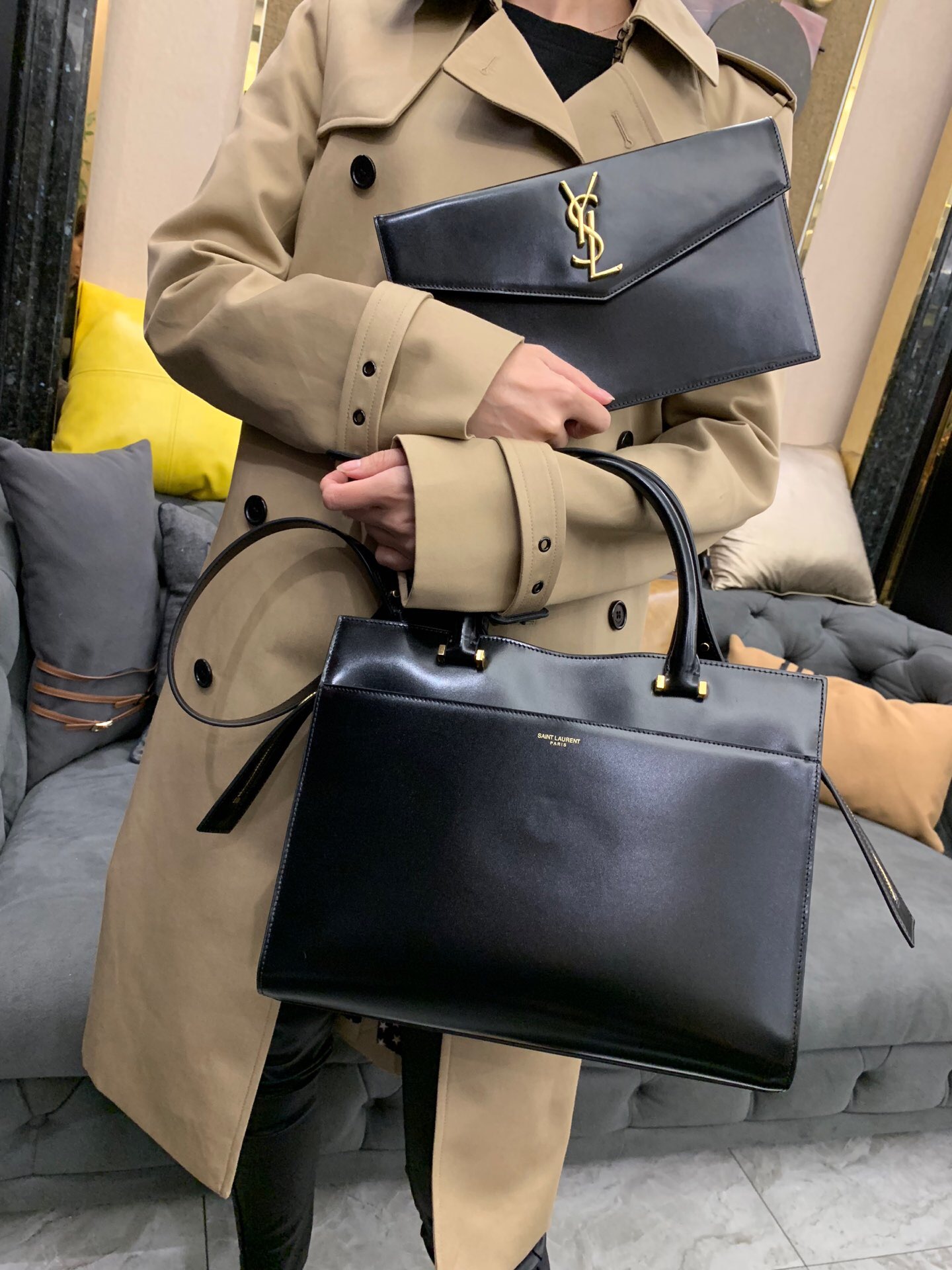 手提袋,配以真皮提手、可拆式肩带及可拆式拉链磁扣手拿包,饰以 YSL 金属标志。