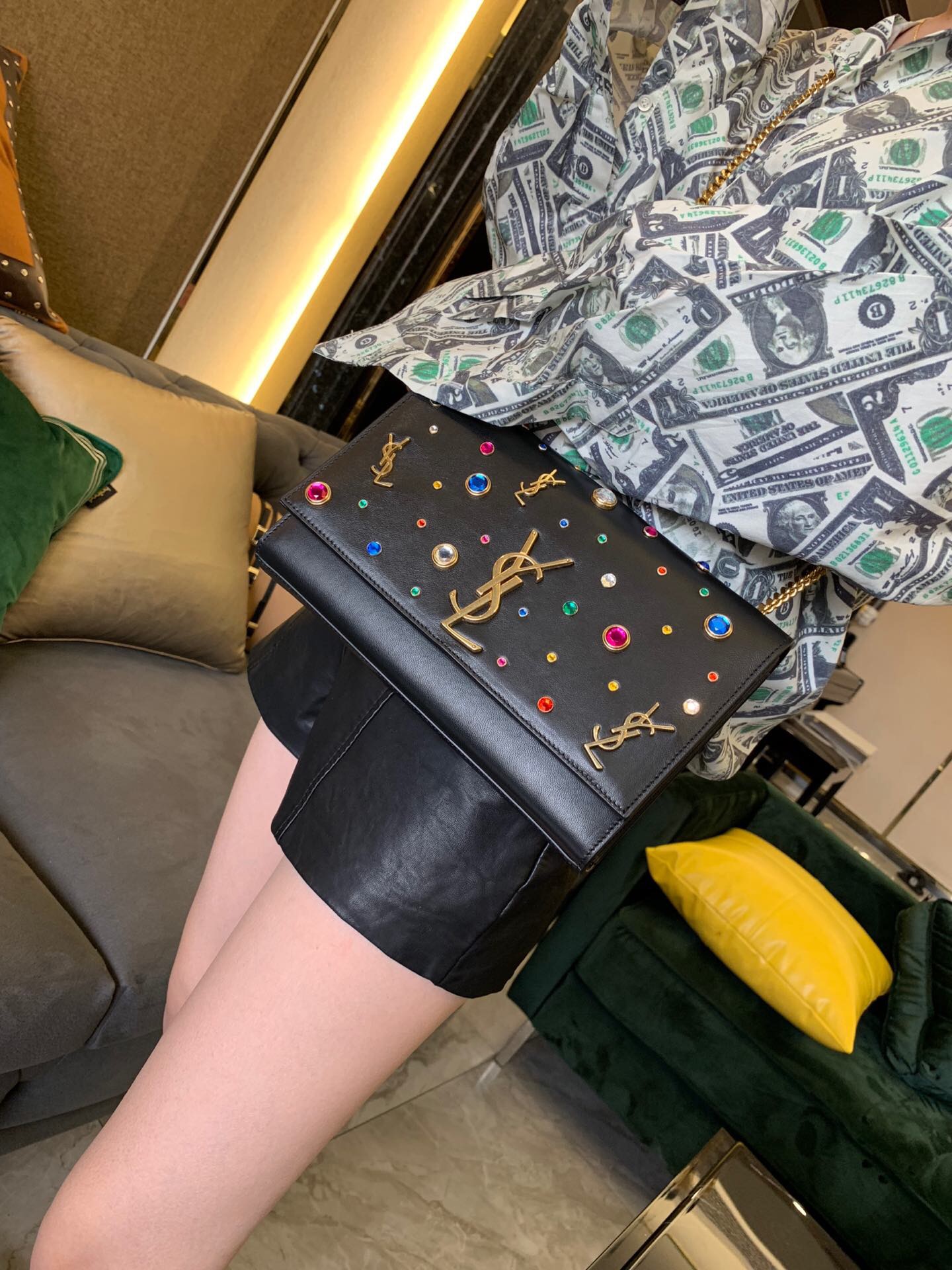 SAINT LAURENT 标志单肩包,配以饰有水晶和 YSL饰钉的翻盖,马衔索式链条及金属联结YSL 标志。
