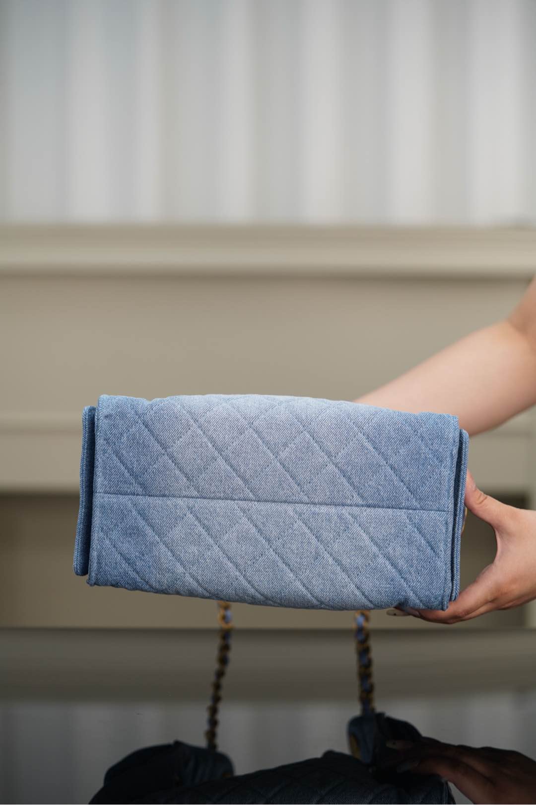 淺藍牛仔 水洗牛仔布材質,風格粗獷而不失優雅,手袋中間配上金屬雙𝐂 𝐋𝐨𝐠𝐨扣,設計隨性更減齡