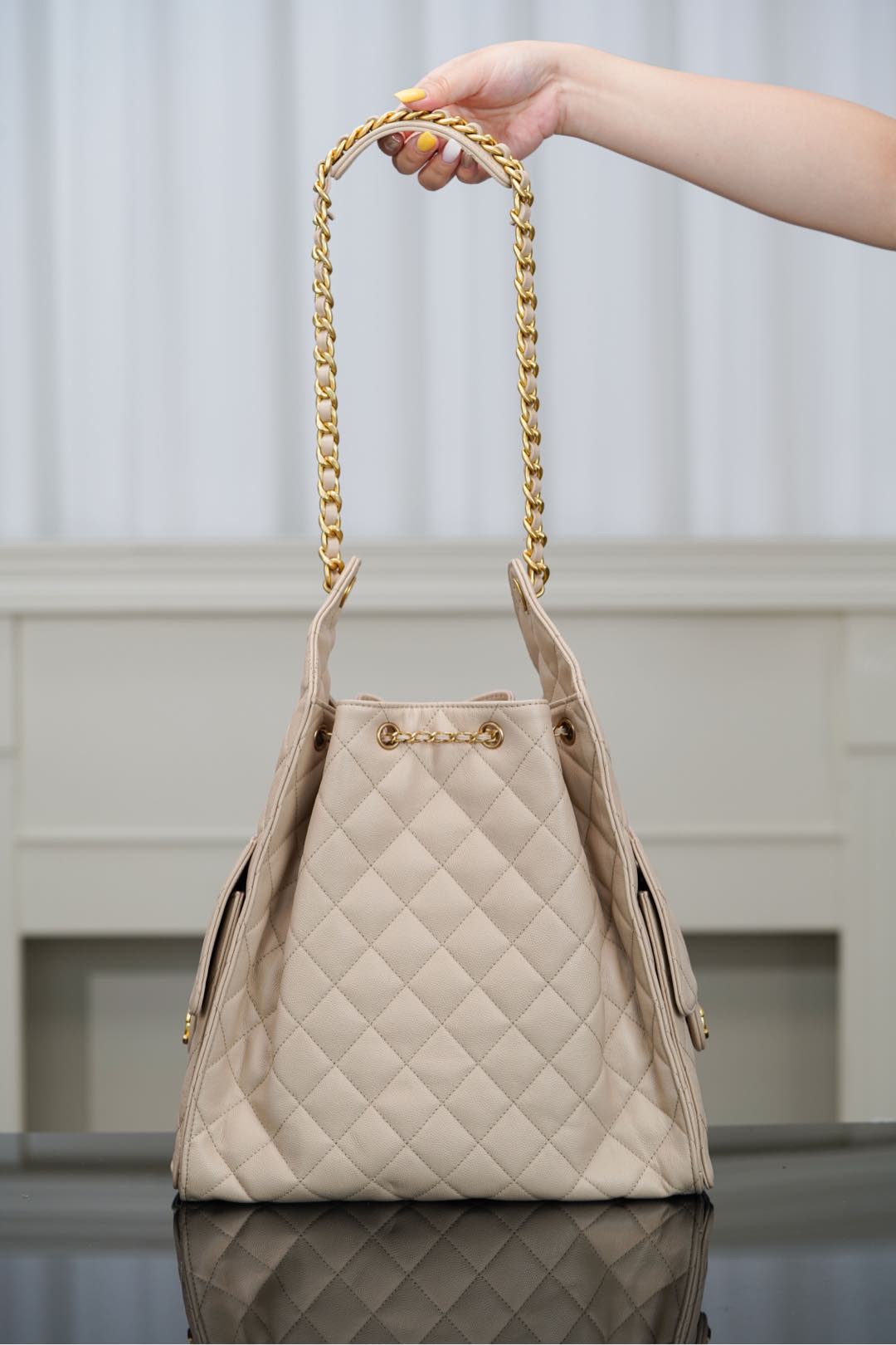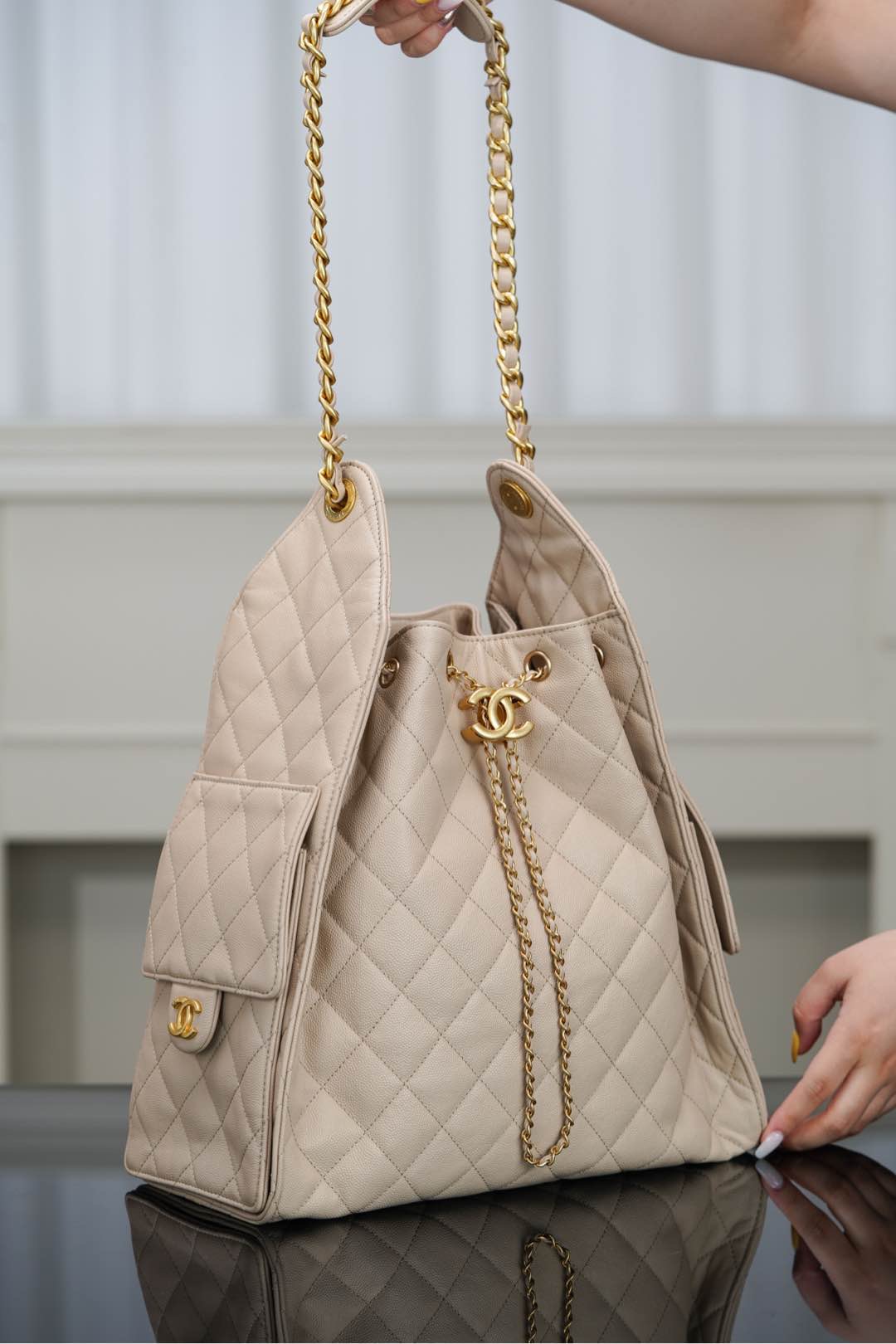 香港黃大仙 香奈兒CHANEL 25S small hobo 杏色魚子醬大號 抽繩水桶包