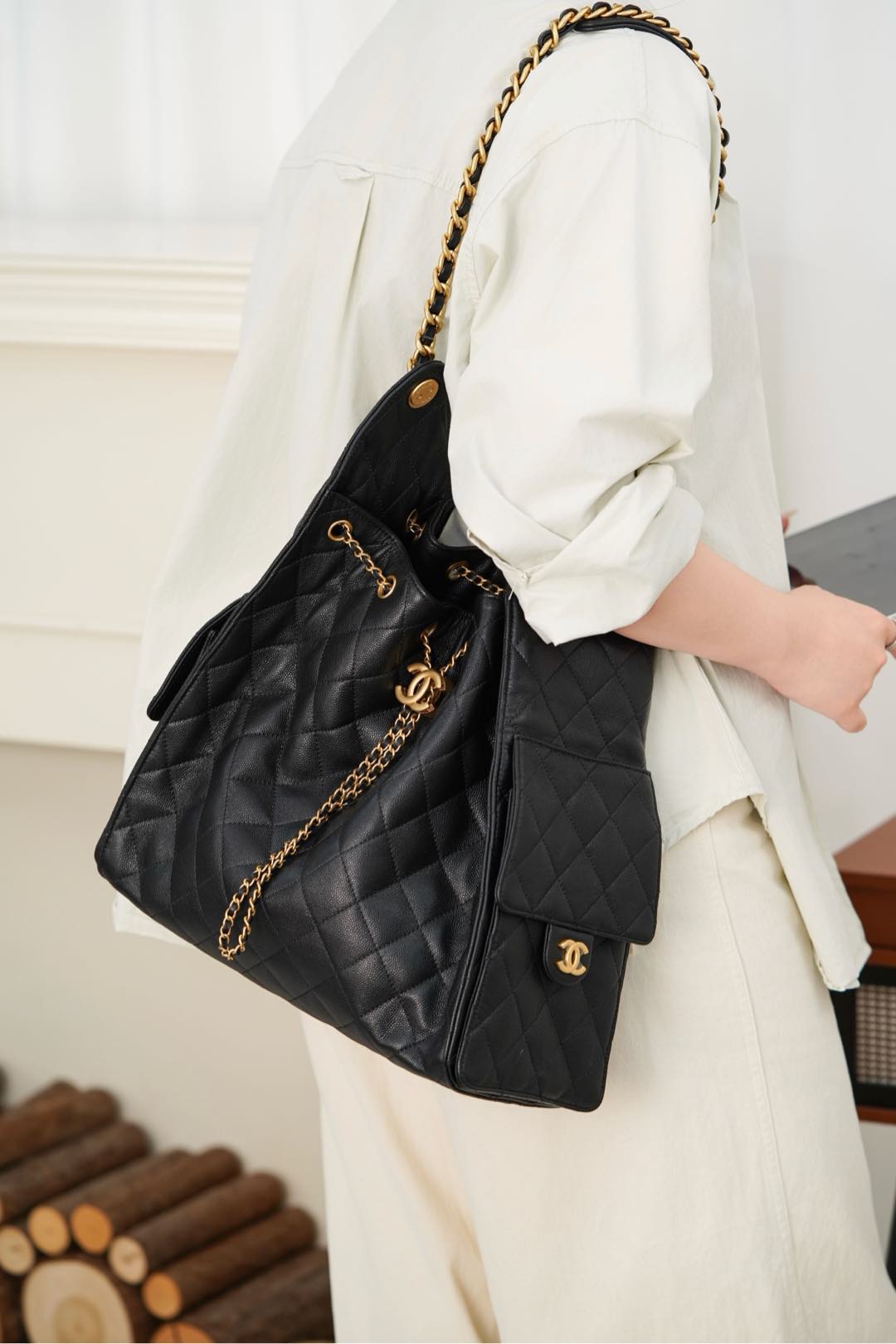 香奈兒魚子醬包包 香港九龍城 chanel 25S small hobo 白色大號 抽繩水桶包