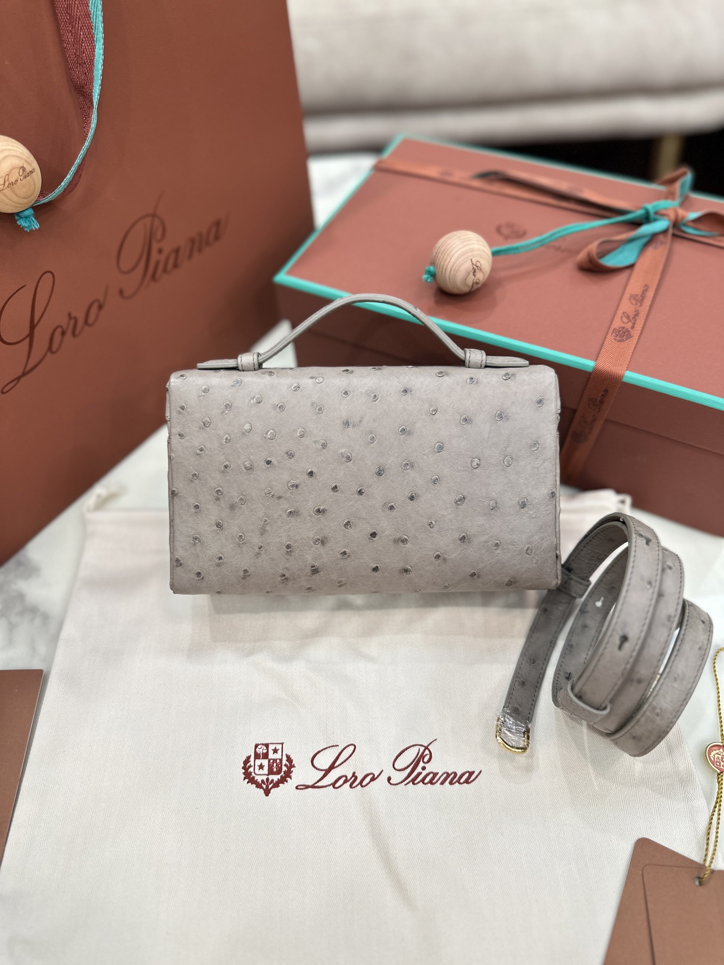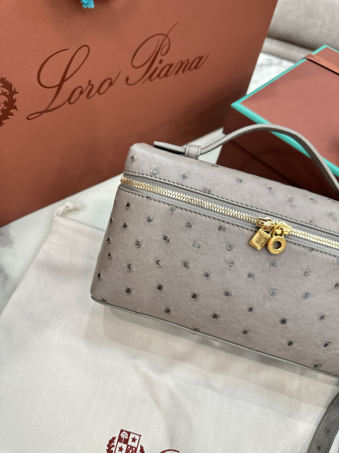 杭州上城區 Loro Piana Extra Poket L19 Ostrich leather 酒紅色 金扣 手拿斜挎包