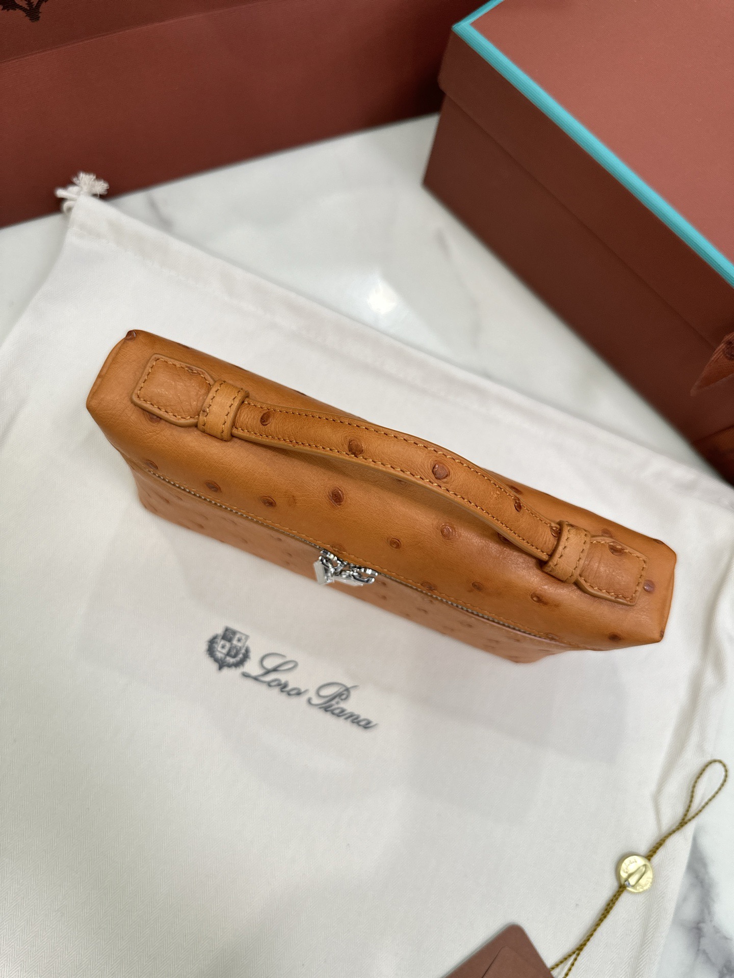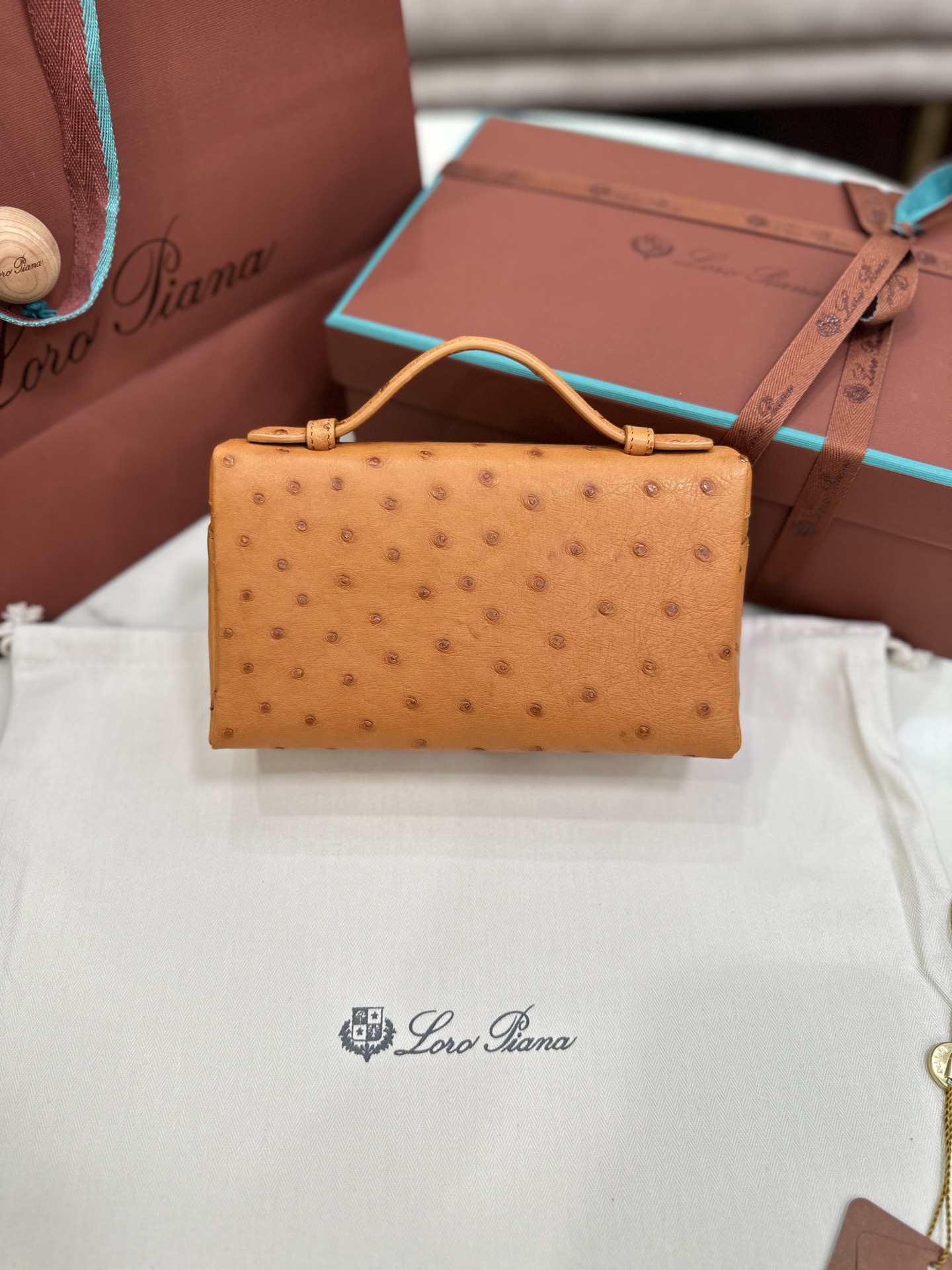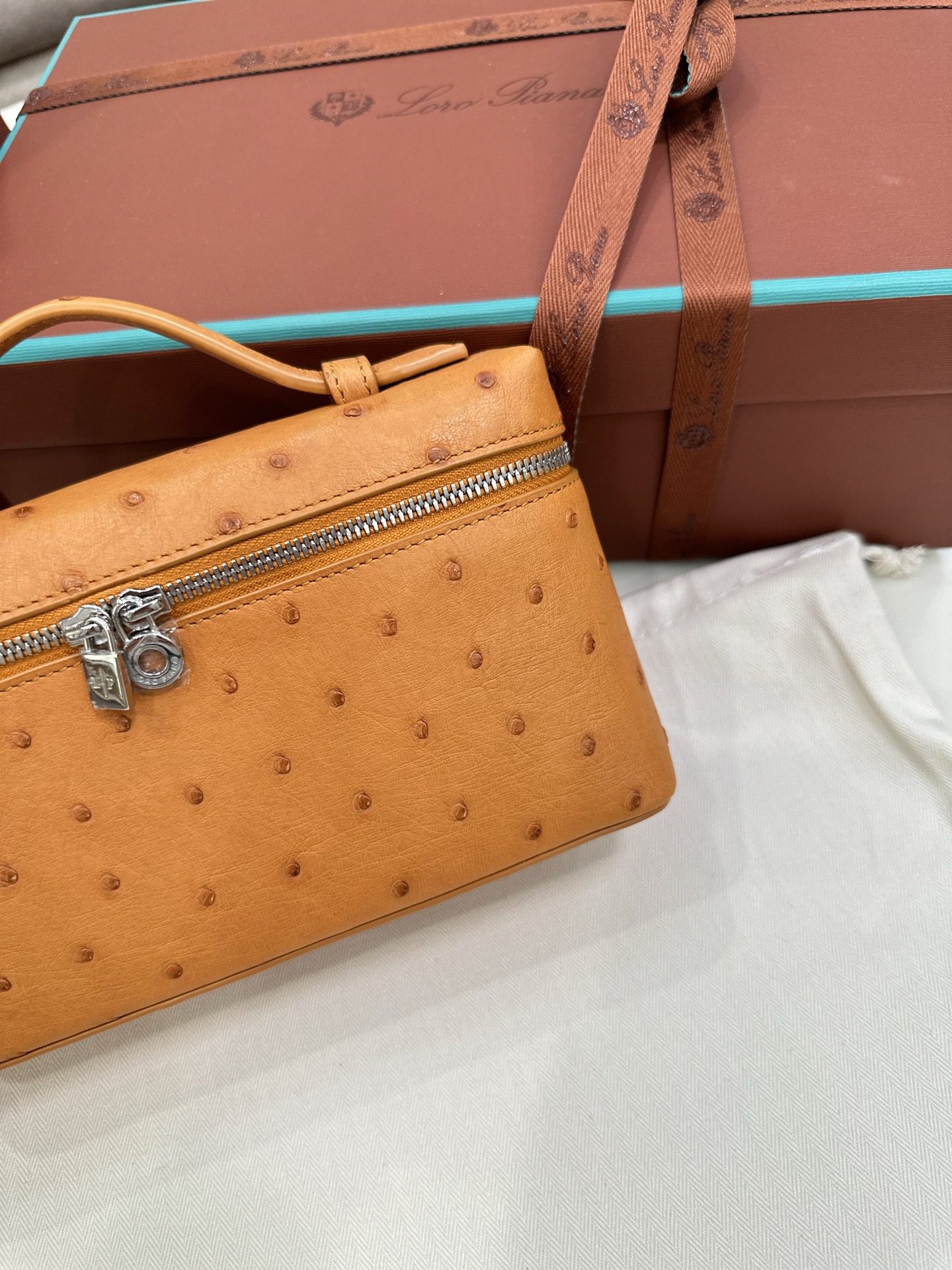 無錫 Loro Piana Extra Poket L19 Ostrich leather淺棕色 銀扣 手拿斜挎包