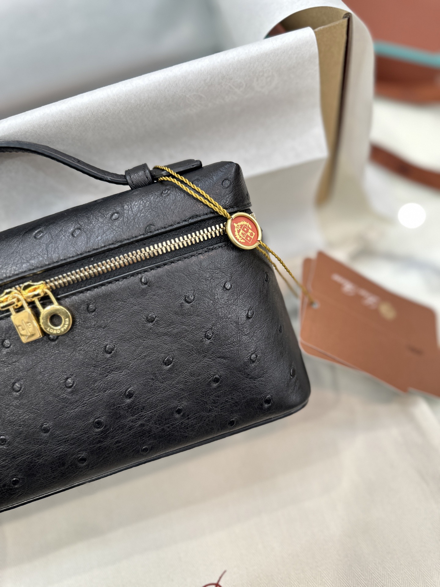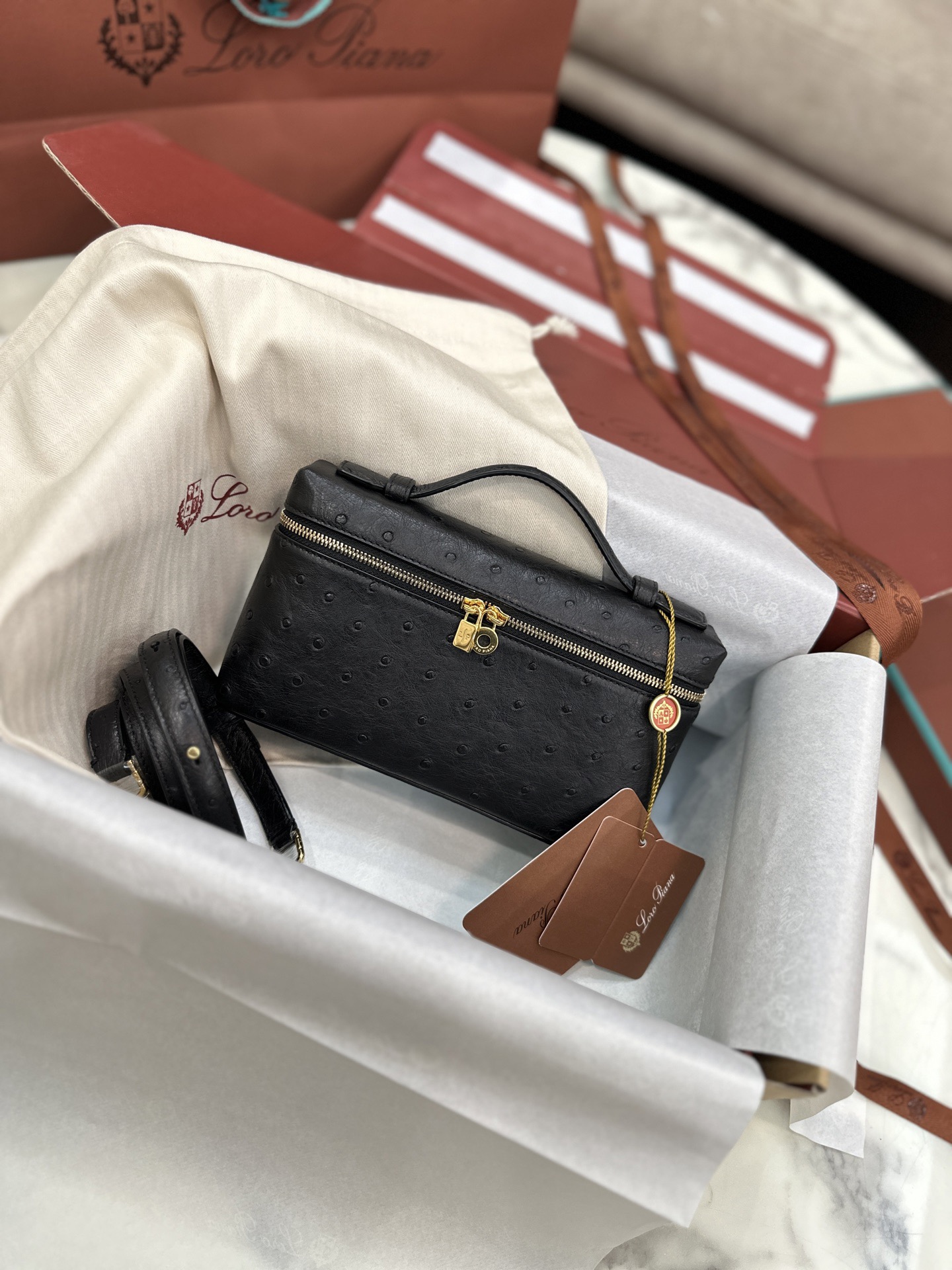 东北 诺悠翩雅 Loro Piana Extra Poket 19cm 鸵鸟皮黑色 手拿斜挎包
