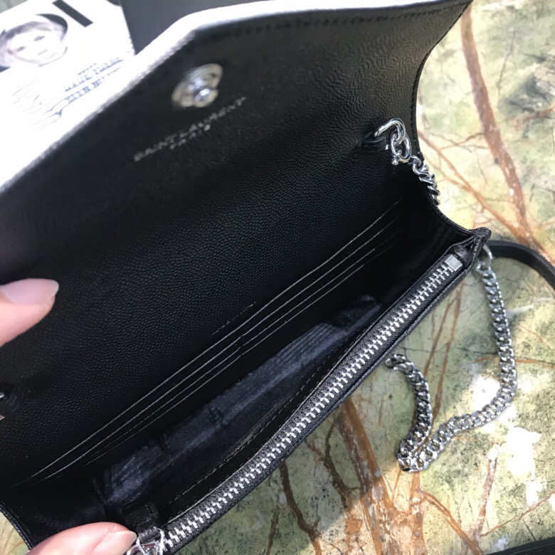 圣罗兰包包 YSL MONOGRAM黑配白色颗粒纹理提花真皮信封链条钱包 WOC 小号信封包