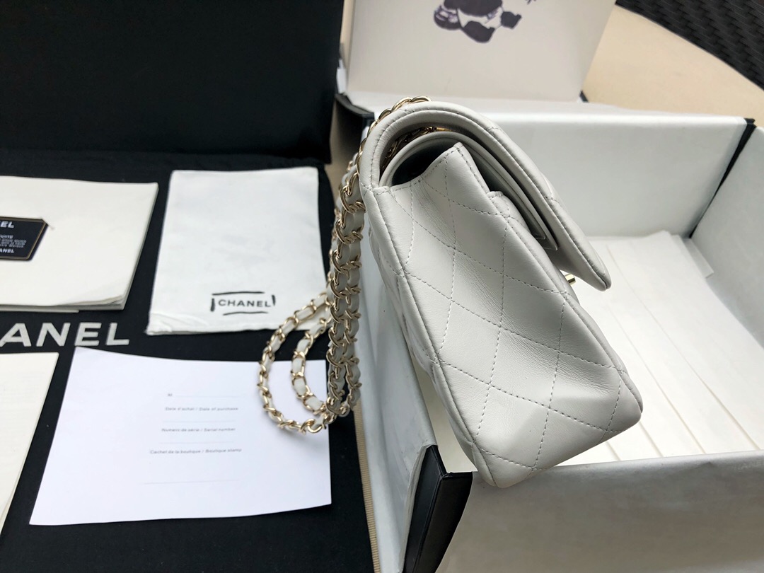 香奈儿官网口盖包 Classic Flap Bag 白色羊皮菱格链条包 浅金色金属