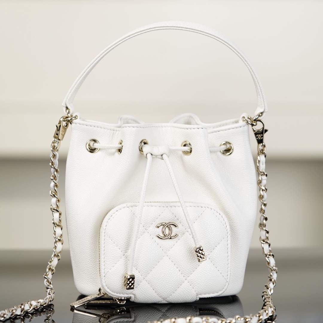 United Arab Emirates CHANEL 25B Caviar Leather Mini Chain Drawstring Small Bucket (White)